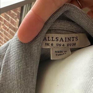 Light gray cardigan with a soft knit texture. Sweatshirt material. Inner drawstrings and zippered pockets. Shawl collar.