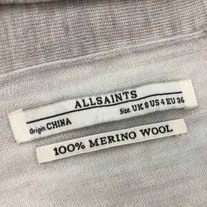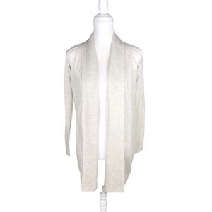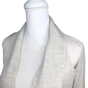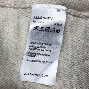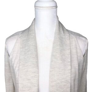 All Saints lightweight 100% heather creamy gray merino wool cardigan. Cut out shoulders, open front. Excellent used condition: no stains, holes, or pills.