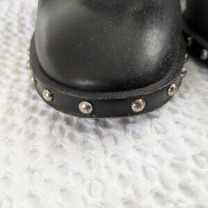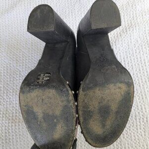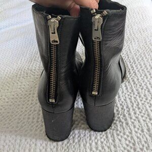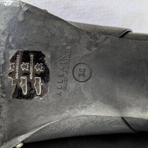 Used pair of All Saints heeled boots, size 38. In fair condition overall: soles are scuffed but the uppers/zippers/etc. are in very good used condition. See pics for details. Stud detailing on soles, exposed zipper detail on back of heel.