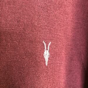 All Saints maroon merino wool turtleneck sweater. Pullover style with turtleneck neckline. Lightweight merino wool knit. Gray embroidered emblem on chest. Size Extra Large XL. Good preowned condition. A couple of tiny holes in sleeves.