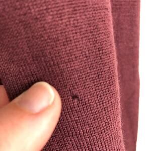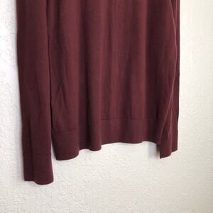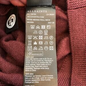 All Saints maroon merino wool turtleneck sweater.  Pullover style with turtleneck neckline.  Lightweight merino wool knit.  Gray embroidered emblem on chest.  Size Extra Large XL.  Good preowned condition.  A couple of tiny holes in sleeves.