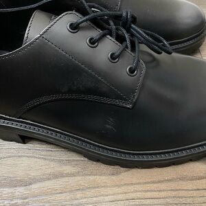 All Saints Tor Plain Toe Derby In Black Brush Off. Lug sole. Style Number: 5968864. The Black Brush off color presents like a worn black on toe and heel like a slightly burnished gray. These are new in box, but box is a little beat up. A little scuffing due to shipping or packaging. A little scuffing on left shoe toe and side of right shoe (shown in last photo). Not really noticeable to most, but wanted to make sure I pointed it out. Please check out the pictures for more details.