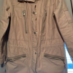 This creamed color utility jacket is 100% cotton and just a good staple for a capsule wardrobe. It can be layered or looks cute on its own with a pair of jeans.