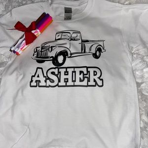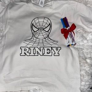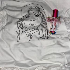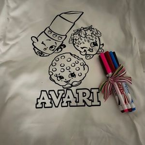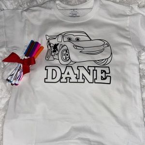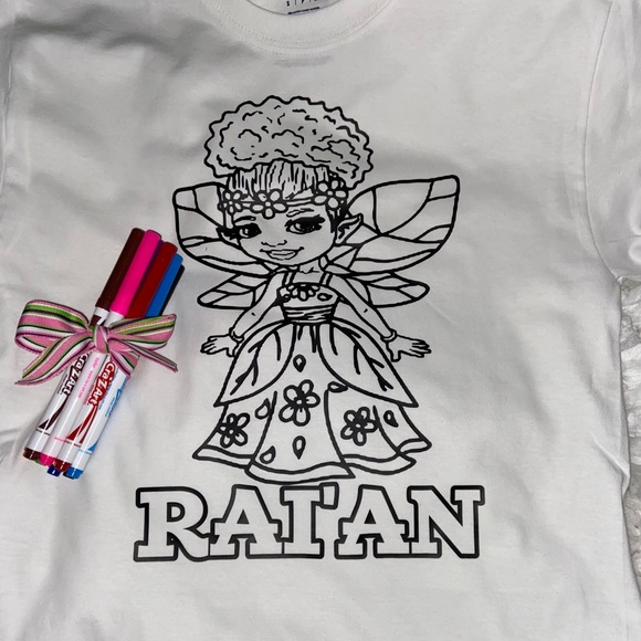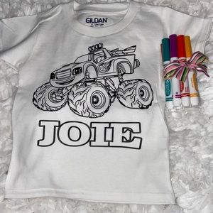 Made to order kids custom coloring shirts & 10 markers. Wash in cold water & let them enjoy coloring them over & over again.