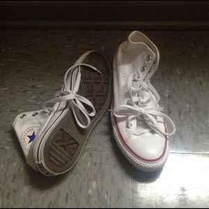Classic white high top converses. Cute with almost any outfit. Can dress down an outfit or make it edgy .
