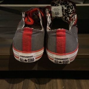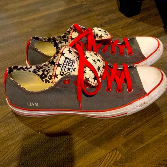 Chucks, size 12. Double tongue (rare for a men’s shoe) stars and cow print interior with red eyes and piping