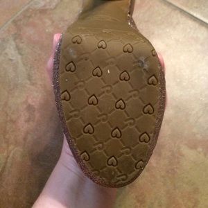 4 inch heel with a 1 inch platform. Gold, glitter, fun. Worn only once!