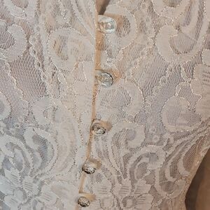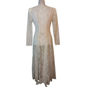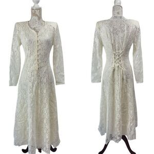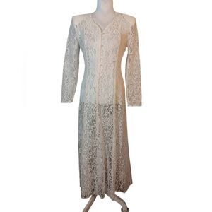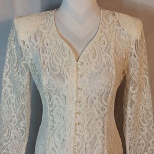 This elegant floor-length dress features long cuffed sleeves and a flattering sweetheart neckline. Made from delicate lace, it is perfect for a bride looking for a vintage-inspired style. The defined waistline enhances the overall silhouette. Size Medium with a pit to pit measuring 20" a waist of 15" laying flat and a length of 52".