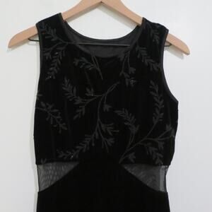 All That Jazz black velvet maxi length vintage Y2K dress. Sleeveless maxi length dress with sheer waist panels. Floral pattern. Slit on back.