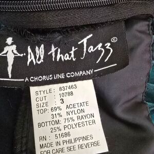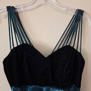 Stunning dress with a black velvet bodice and green satin skirt. Features multiple thin straps for a unique look.