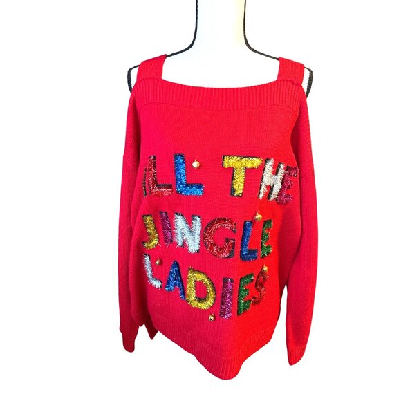 All The Jingle Ladies Ugly Christmas Sweater Bells Tinsel Open Shoulder Large