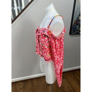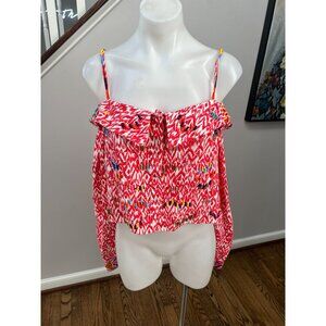 Beautiful 100% cotton top. Off the shoulder, beaded, red and white print.