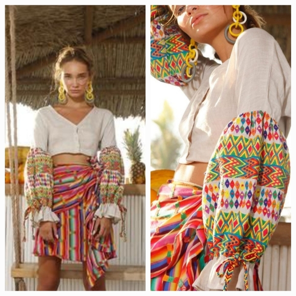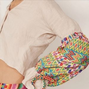 A super fun, beautiful, colorfully embroidered set to wear for celebrations, casual occasions, music festivals or anywhere you want to bring your sense of joyful spirit! It is rare to find these two pieces being sold together. Both pieces are adorned with intricate hand embroidery, highlighting the brand's efforts to support female artisans in rural parts of the world. All Things Mochi is designed in Amsterdam.