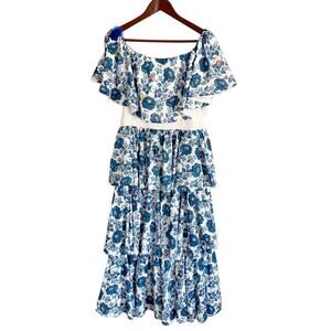 This striking All Things Mochi Barta Midi Dress captures the label’s signature artistry with its hand-finished embroidery and tiered silhouette. Crafted from breathable cotton with a pottery-inspired blue-and-white floral print, it features a flounced off-the-shoulder neckline trimmed with crochet detailing and subtle embroidered accents in fuchsia, yellow, and orange. The voluminous layered skirt moves beautifully, while the slip-on design offers effortless wear for vacation or summer gatherings.