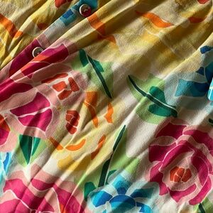 Buttons down the front, with strap to tie around the waist. Beautiful floral pattern and sleeve design.