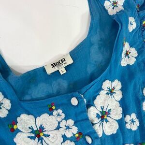 All Things Mochi Mini Dress Womens Large Blue Kay Linen Embroidered Floral