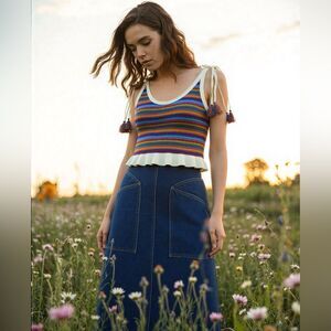 Embroidery Knit Multicolor Rainbow Stripe Top with Ivory Trim. Adjustable tie straps with tassels. Ruffle ribbed peplum hem. From the ‘Polynesian’ Collection.
