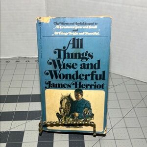 Vintage book 'All Things Wise and Wonderful' by James Herriot. Features a blue cover with black text and an illustration.