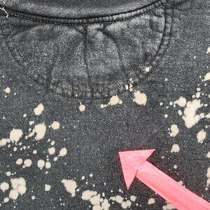 Pullover style long sleeve crewneck sweatshirt - shade of dark gray with a splatter tie dye like pattern. Distressed white graphics on he front with All Time Low spelled out, Missing You lyrics & Heart logo. 100% Cotton. Made in Honduras.