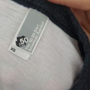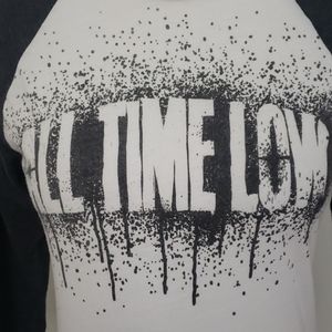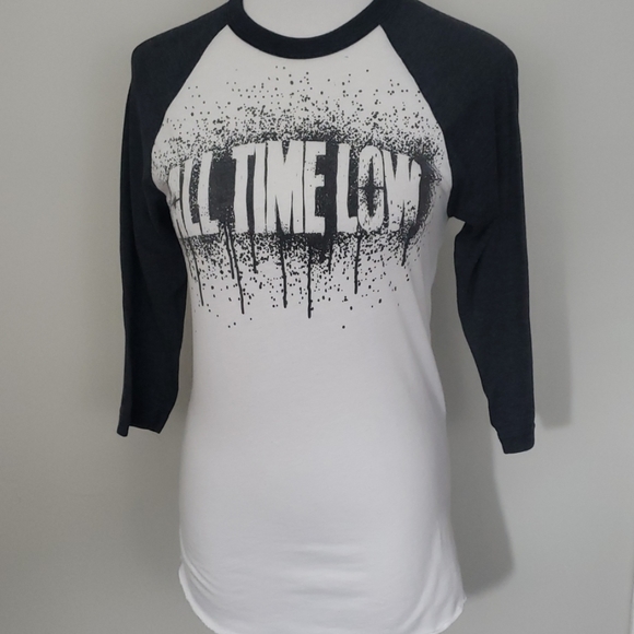 White body with dark gray "All Time Low" print. Gray 3/4 length sleeves and neckline. American Apparel 50/50 Shirt, size XS. Gently used with no flaws (holes, stains, etc.).