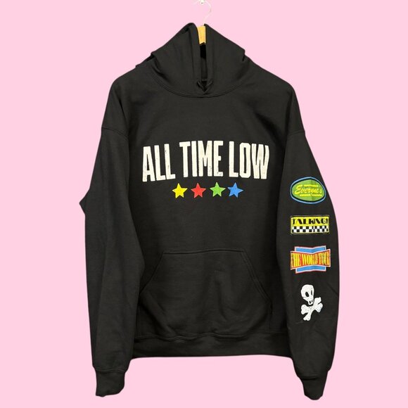 All Time Low Everyone's Talking Tour Rock Band Hoodie L measures 23 inches pit to pit 26 inches long Amazing sweater with graphics on both sides of the hoodie perfect for fans of the legendary band All Time Low Firsthand overstock in great condition has markings from manufacturing process that may or may not wash off