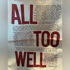 Perfect canvas tote bag with Taylor Swifts song lyrics, “All Too Well” printed on the front and the back of the bag. 1” wide shoulder straps. Brand new. Never used.