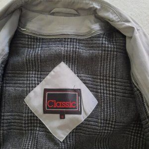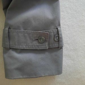 Size 10. CLASSIC 3 quarter length all weather coat with detachable hood. Zip out flannel lining extends to sleeves, is secured at bottom of sleeves on the inside with button & loop. Pocket and sleeve lining is satin for easy on/off. 5 button front closure, buttons are secured with anchor buttons on inside. Adjustable banded 2 button sleeves. 2 slash front pockets, matching belt and belt loops.