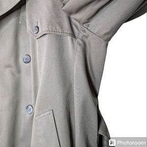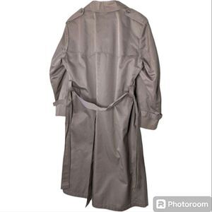Double breasted heavyweight belted classic trench coat. Fully lined. The zip out inner liner is missing, but the cotton poly shell is so thick and substantial the coat will see you through all but the coldest winter weather. There is a 3" gusset on each side for ease of movement and accommodation of thick clothing.