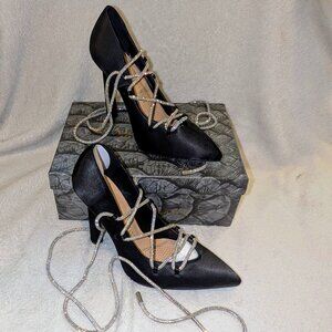 Sleek black pointed heels with glamorous silver lace-up. Statement-making stilettos.