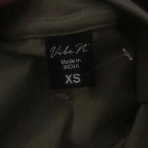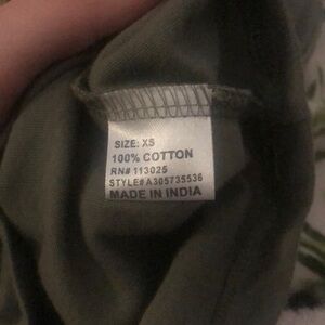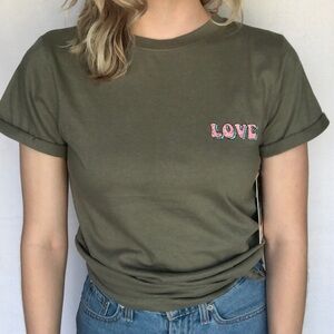 Soft and comfy olive color tee with distressed graphic on front and back. Groovy colors and font. Looks super cute tucked or knotted in the front.
