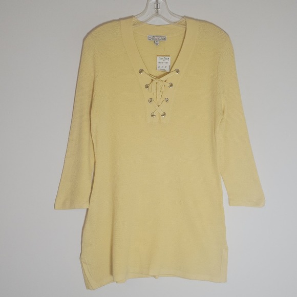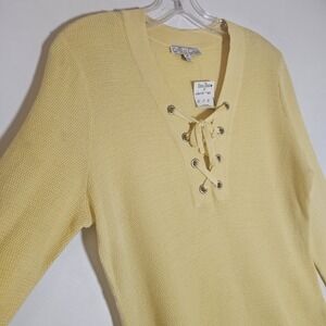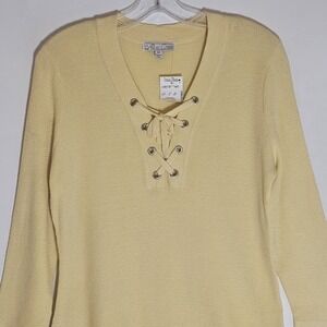 Up for sale is an - All at Once Sweater Womens Medium Yellow Waffle Knit Lace Up Tie Neck Tunic Top