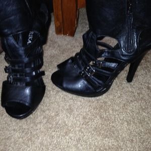 All black cage bootie heels zips in the inner side of foot. Pleather like material. Very cute and sexy for evening and that rocker edgy look. Three adjustable straps in the front. In great condition only wore once.