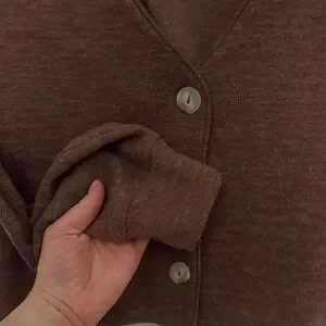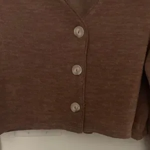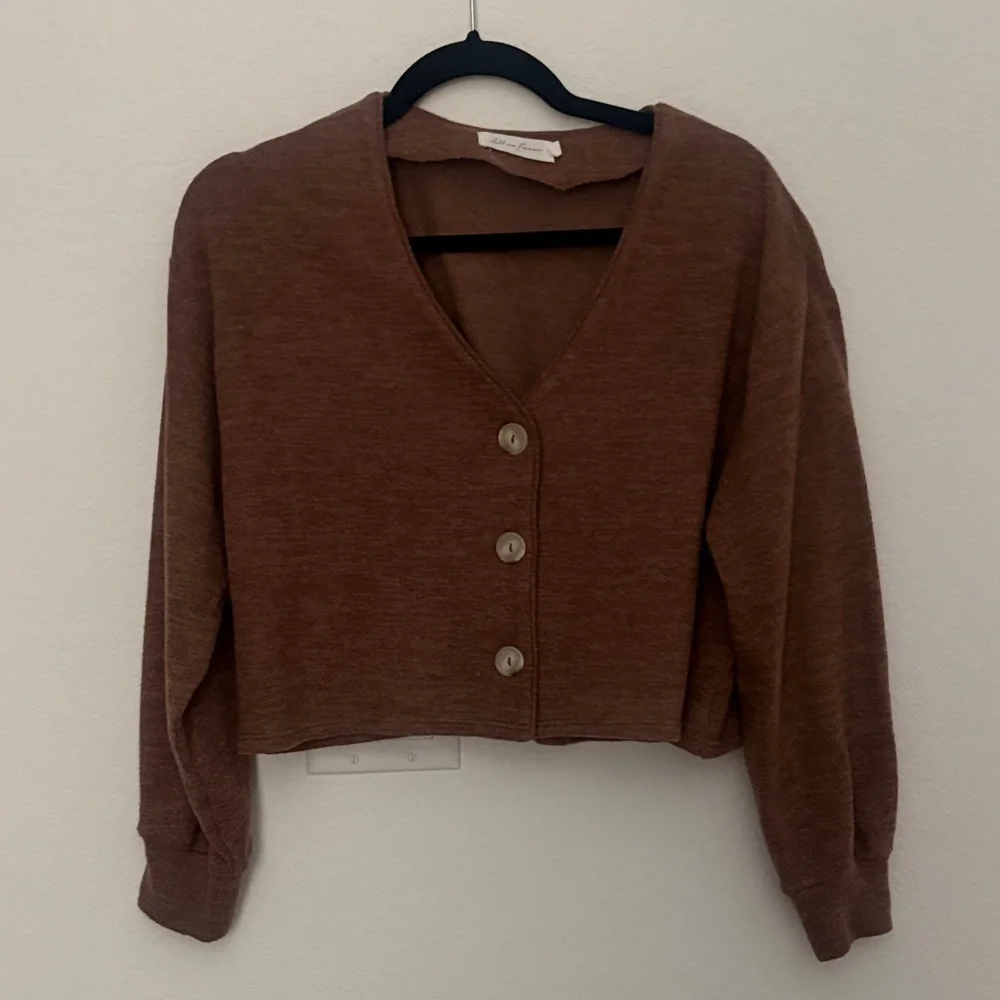 Soft knit button-up cardigan. Classic V-neck silhouette. Long sleeves for layering. Neutral versatile shade.