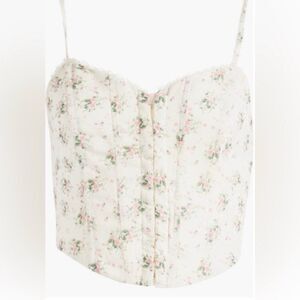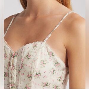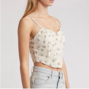 This romantic cream floral print corset-inspired camisole detailed with structured boning and lacy trim at the neckline for an added touch of charm with flattering sweetheart neckline and delicate spaghetti straps. The fitted design and cropped length create a stylish silhouette, perfect for showcasing your midriff.