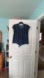 Stylish navy blouse with white stripes. Features ruffle sleeves and tie-front detail. Perfect for casual outings.
