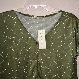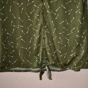 All in Love Women's Green Arrow Print Cap Sleeve Button-Up Knot Front Top Size M