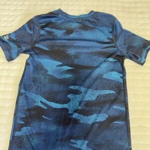 Stylish rashguard with blue and black camo pattern. Perfect for swimming adventures.