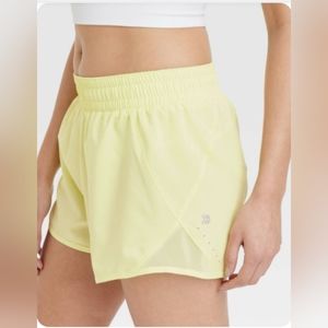 Women's yellow mid rise running shorts. Has moisture wicking and quick dry material. Includes some reflective details in the front. Has a zippered pocket, small front waistband pocket and a continuous loop drawstring for an adjustable fit.