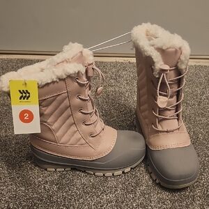 Cozy and stylish winter boots. Pink upper with gray sole. Ideal for cold weather.