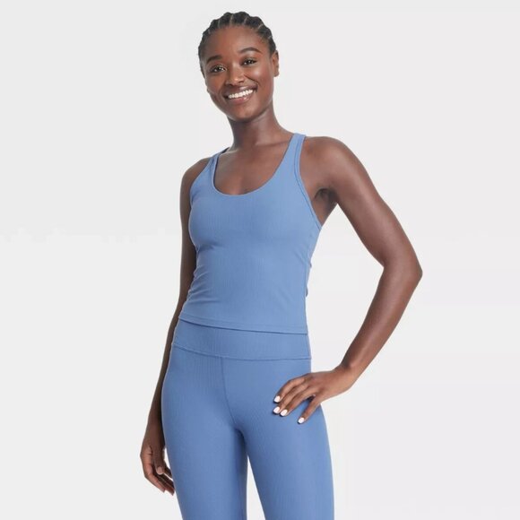 All in Motion XS cropped tank, Women’s blue ribbed racerback top, Seamless workout tank with shelf bra, Built-in bra cropped yoga tank, Moisture-wicking exercise tank, Stretchy rib knit tank top, Fitted midriff tank All in Motion, Women’s seamless activewear top, All in Motion soft rib tank XS, Yoga tank top with shelf bra