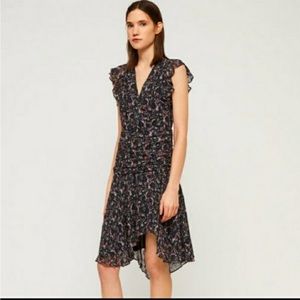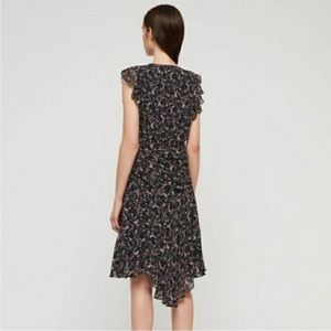 Sleeveless, v-neckline, ruched waist, asymmetrical skirt