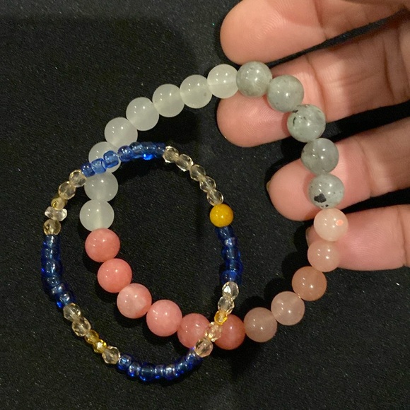 These two handmade bracelets are a beautiful combination. One is primarily pink, featuring hints of gray that represent the colors of the sky during sunset. The other bracelet is delicately crafted with a wooden bead, evoking the softness of clouds and the sky. Together, they create a harmonious set that reflects the beauty of nature.