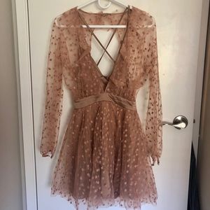 Features one of a kind star embroidered tulle, stretch satin, ruffled plunging neckline, layered tier skirt, crystal buttons, and invisible zipper.