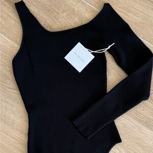 NWT “Cienna” bodysuit in ribbed spandex blend. Gusset snap button closure with thong back.
