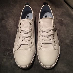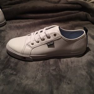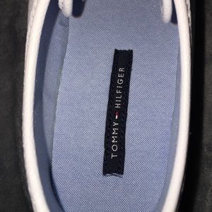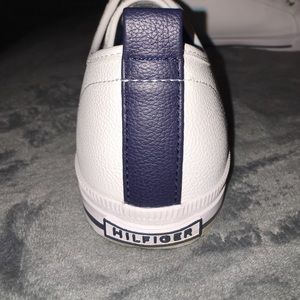 White Tommy Hilfiger shoes with a blue strip in the back. Super comfy as well! Only worn once!
