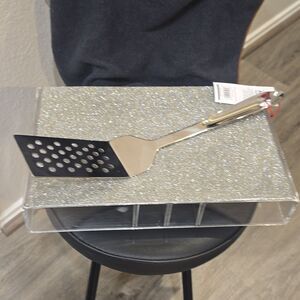 Elegant stainless steel slotted turner. Perfect for cooking and serving.