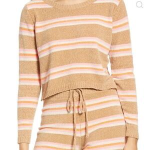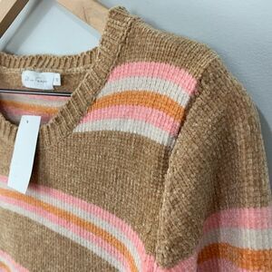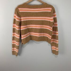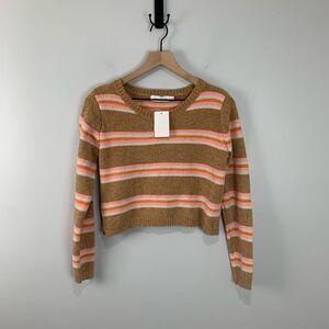 New with tags. Tan/brown sweater with multicolored stripes, long sleeves and cropped hem. Pit to pit= 18”, shoulder to hem= 17.5”.
