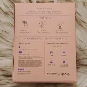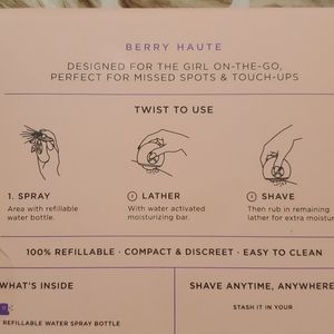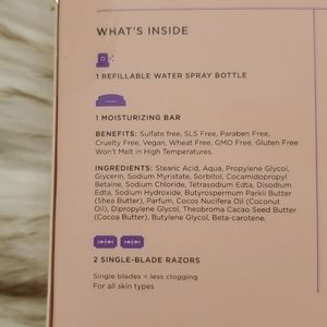 Includes water bottle, moisturizing lather bar, and single blade razor