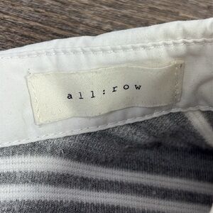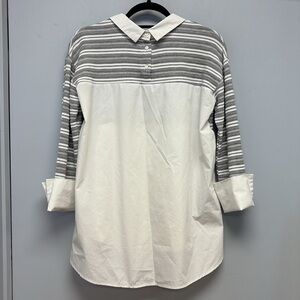 Nice top All:Row collared pullover long sleeve blouse, gray and white stripes, bottom half is cotton / poplin blouse, top half is knit material. Three buttons down the back, oversized top. This item is in excellent like new condition. Approximate measurements are in the pictures.
