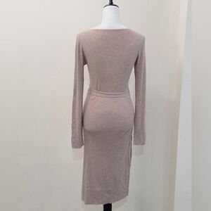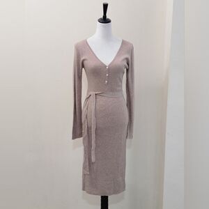 Keywords: All Row sweater dress | ribbed knit midi dress | wool blend bodycon dress | mauve cozy dress | soft knit long sleeve dress | size L sweater dress | tie waist knit dress | minimalist chic dress | neutral fall outfit | cottagecore dress | comfy cute knit dress | quiet luxury style | elegant knit midi | lounge to streetwear dress | cold weather staple